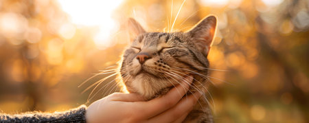 Ginger cat with eyes closed enjoys being petted by a man's hand under sunlight, top view on a warm sunny day.