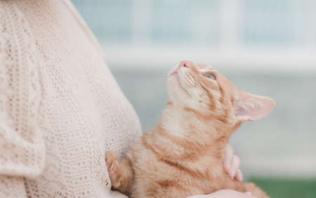 Close up of domestic cat in hands of unrecognizable woman. Unknown female strokes cute pussycat