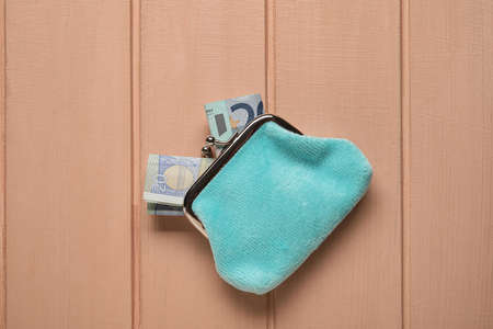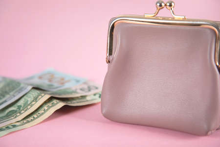 open women's wallet with dollars and hryvnia on a light beige background close-up