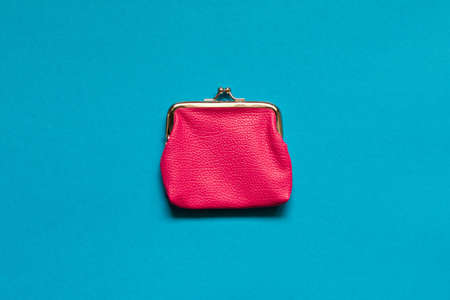 Female wine-colored wallet on pastel pink background. Flat lay. Copy space.