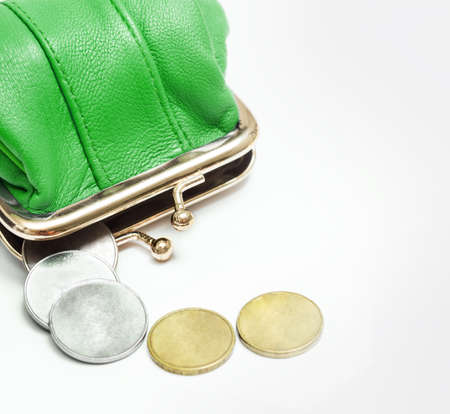 Buying for dollars. Women's green purse lies on a white background. A wad of money peeps out of the wallet.