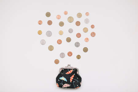Open wallet with different coins isolated on white background top view. Financial crisis, poverty, lack of money concept