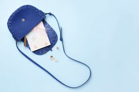 Open stylish leather bag with a purse on a pastel background. Top view, minimalism.