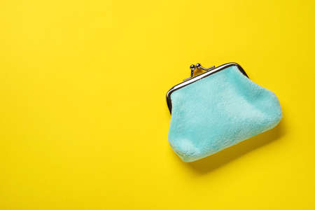 yellow old wallet with a fragment of ten dollars bill and credit card on gray background, social pension banner concept, shallow depth of field