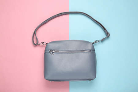 Female trend accessories on a blue pastel yellow background. Leather bag, red purse, braided belt.