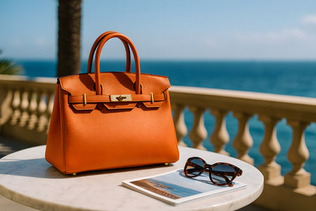 Orange leather handbag on marble table with sunglasses and sea view – AI generated