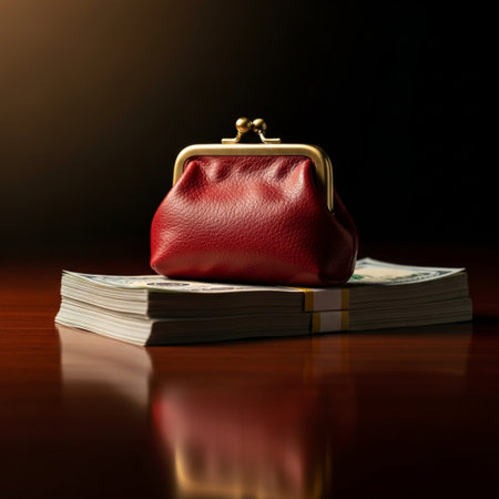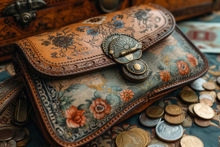 Antique luxury bag and scattered cash coins.