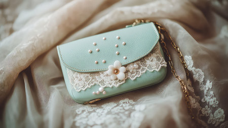 This elegant mint green handbag features delicate lace and pearl decorations, resting beautifully on a soft fabric background, perfect for fashion lovers.