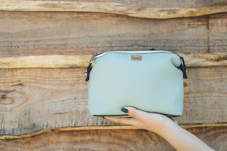 Woman hand holding blue handbag on wooden background.