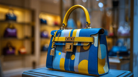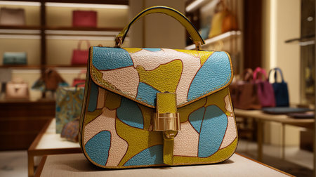 Sophisticated handbag with abstract pattern and golden accents displayed in store