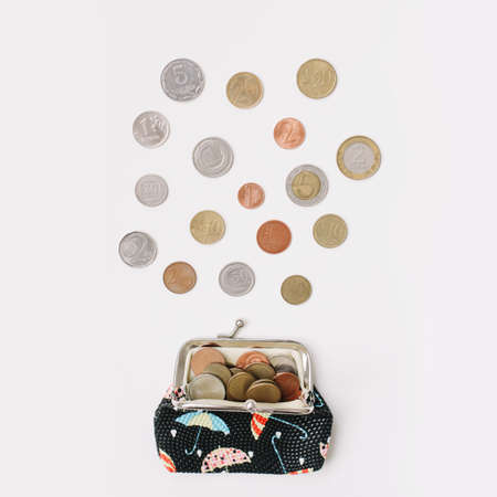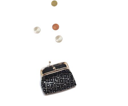 Open purse with coins falling on white background isolated