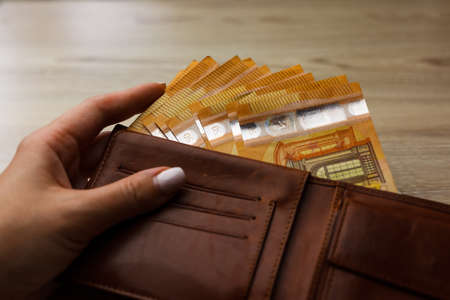 Wallets with banknotes inside. Cash, 50 euro bills and 20 euro bills.