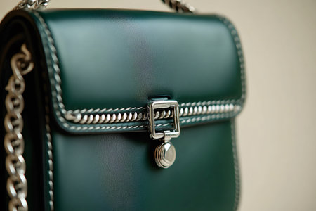 Stylish green leather bag with decorative stitching and a silver chain strap exudes luxury and sophistication