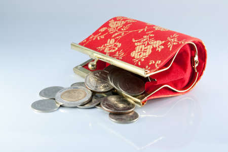 red wallet and coins on white background