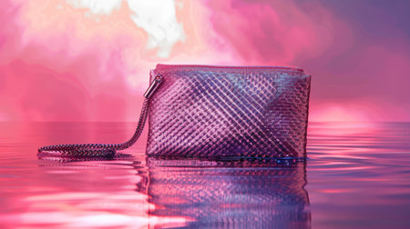 A stunning metallic purse showcased against a dreamy pink and purple backdrop, reflecting elegance and style, ideal for fashion and accessory projects.