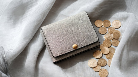 This image showcases an elegant metallic wallet placed on a soft fabric background, surrounded by scattered coins. It evokes a luxurious and stylish atmosphere, perfect for finance-related themes.
