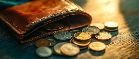 A worn leather wallet with scattered coins on a wooden surface, illuminated by warm sunlight, symbolizing finance, savings, spending, or economic hardship.