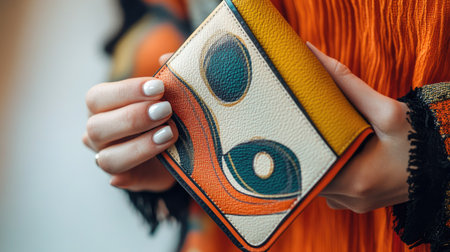 A fashionable hand of a woman holding a luxurious wallet with intricate details, set against a neutral backdrop.