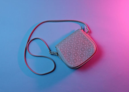 Top view photo of fashionable leather bag, blue red neon light