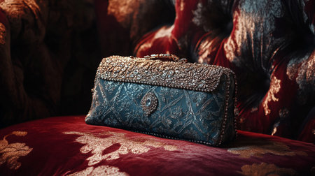 Luxury blue leather clutch on a sofa in a vintage interior