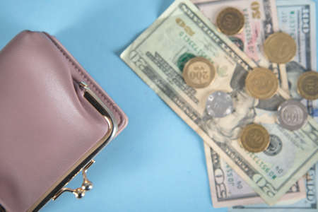 open women's wallet with dollars and hryvnia on a light beige background close-up