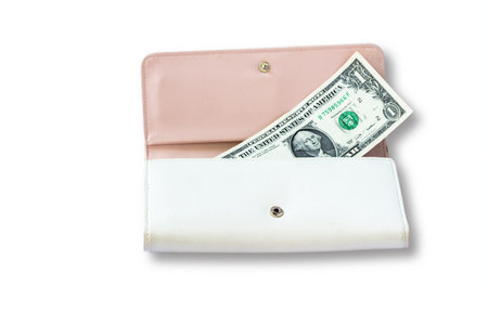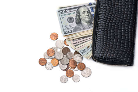 Wallet with dollars banknotes isolated on white background, copy space, one hundred american money