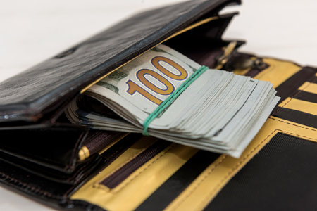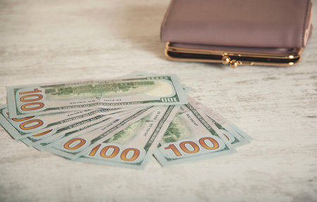 Bundle with american dollars in a retro wallet on a wooden background. Vintage Leather purse with Hundred Dollar Bills. Concept of earning cash, economy, salary and bank deposit.