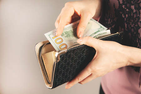 Young woman pulls out dollar banknotes money from brown wallet bag