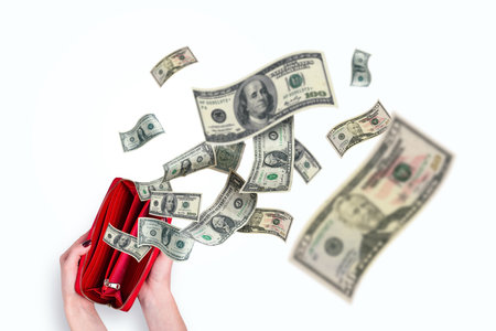Female hands holding a red wallet and dollars flying, creative idea. Inflation and crisis, concept. Waste of money. Purchases. Money is flying away