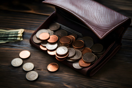 Euro cash and euro cents with brown leather wallet on brown wooden background