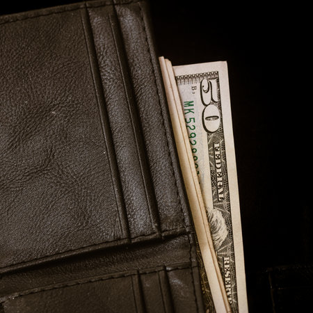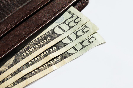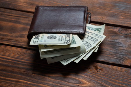 Brown leather wallet with dollars on an old wooden surface. Close up.