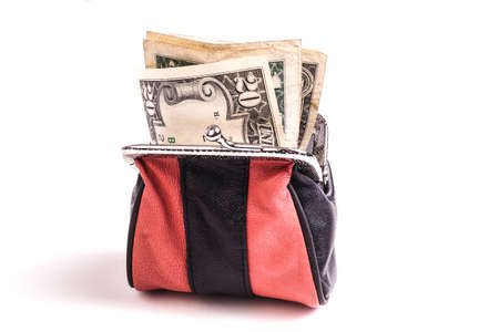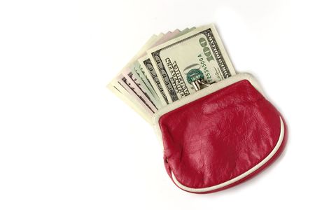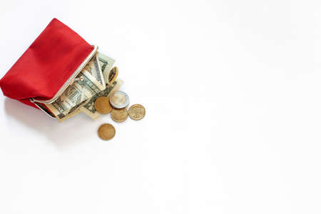 Red purse and hundred dollar bills on a white background. Minimalistic financial concept of family budget