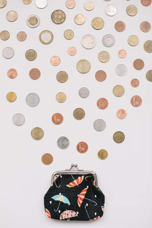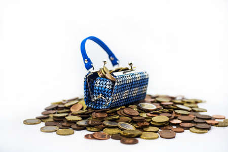 red retro purse and a stack of of coins on a light wooden background / money saving storage