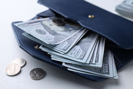 Dollar banknotes in wallet and coins on white table, closeup. money exchange