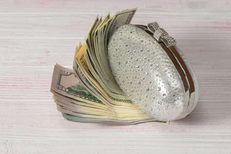 womens handbag with rhinestones lies on dollar bills on a light background.