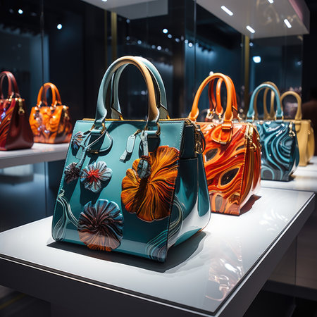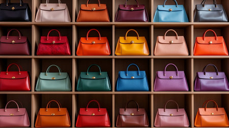 Colorful luxury handbags display in fashion boutique
