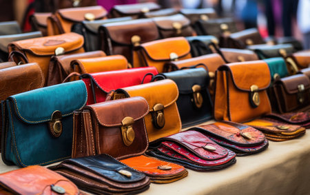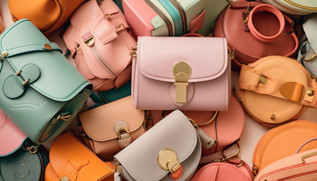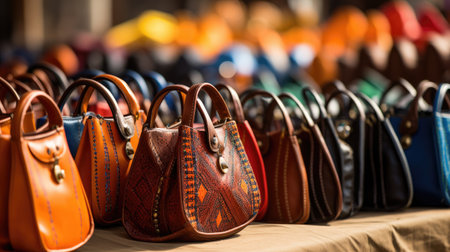 Fashionable collection of leather purses in multi colored patterns for sale generated by artificial intelligence
