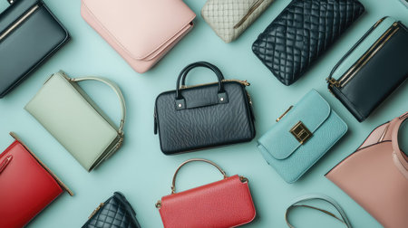 Many leather purses on a colored pastel background. Top View