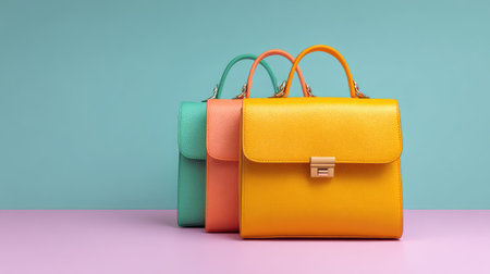 This image showcases three stylish handbags in vibrant colors against a pastel background, perfect for fashion promotions or accessory displays in retail settings.