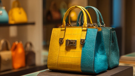 Stylish handbags in bold yellow and teal featuring a reptilian leather texture