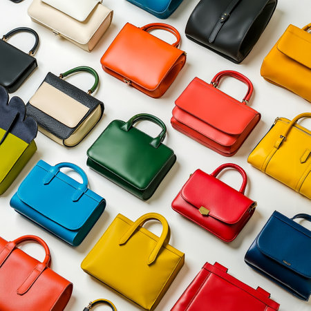 Six leather handbags in striking colors such as red, orange, yellow, and blue, are neatly arranged on a white studio surface.
