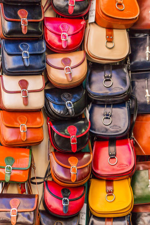 colorful leather handbags collection on florentine market, Florence, Italy, Europe