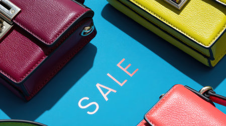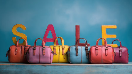 Showcase your fashion products with this vibrant image of colorful handbags displayed against a bright background with sale text. Perfect for retail promotions!
