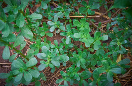 Gardening. Home garden, flower bed. House, field, farm, village. Green leaves, bushes. Purslane, annual herbaceous succulent plants. Portulaca oleracea. Tasty and healthy