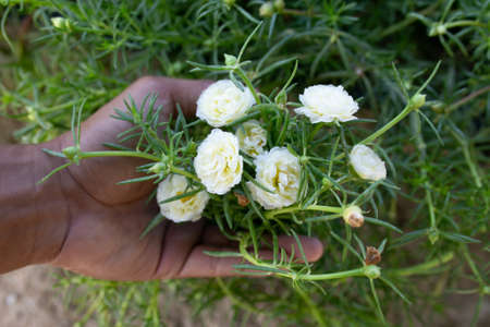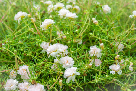 moss rose, portulaca grandiflora, japanese rose, sun plant or purslane blooming on the flower garden with green leaves background.