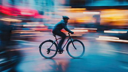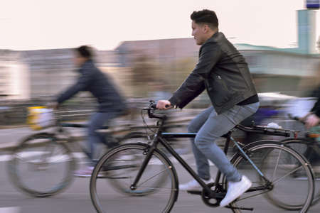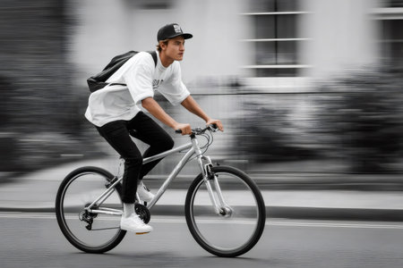 Young man riding a bicycle on a blurred background, showing urban speed and energy