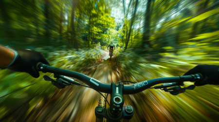 A dynamic shot of a cyclist speeding through a lush forest trail, the motion blur emphasizing the exhilaration and freedom of outdoor sports.