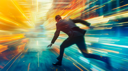 A businessman runs through a city street with a briefcase, captured in a motion blur.