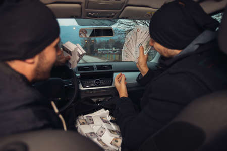 Two happy bank robbers celebrating their successful hit while sitting in the car they used for the robbery.