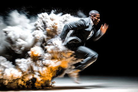 Businessman in black suit running in dust cloud on black background.